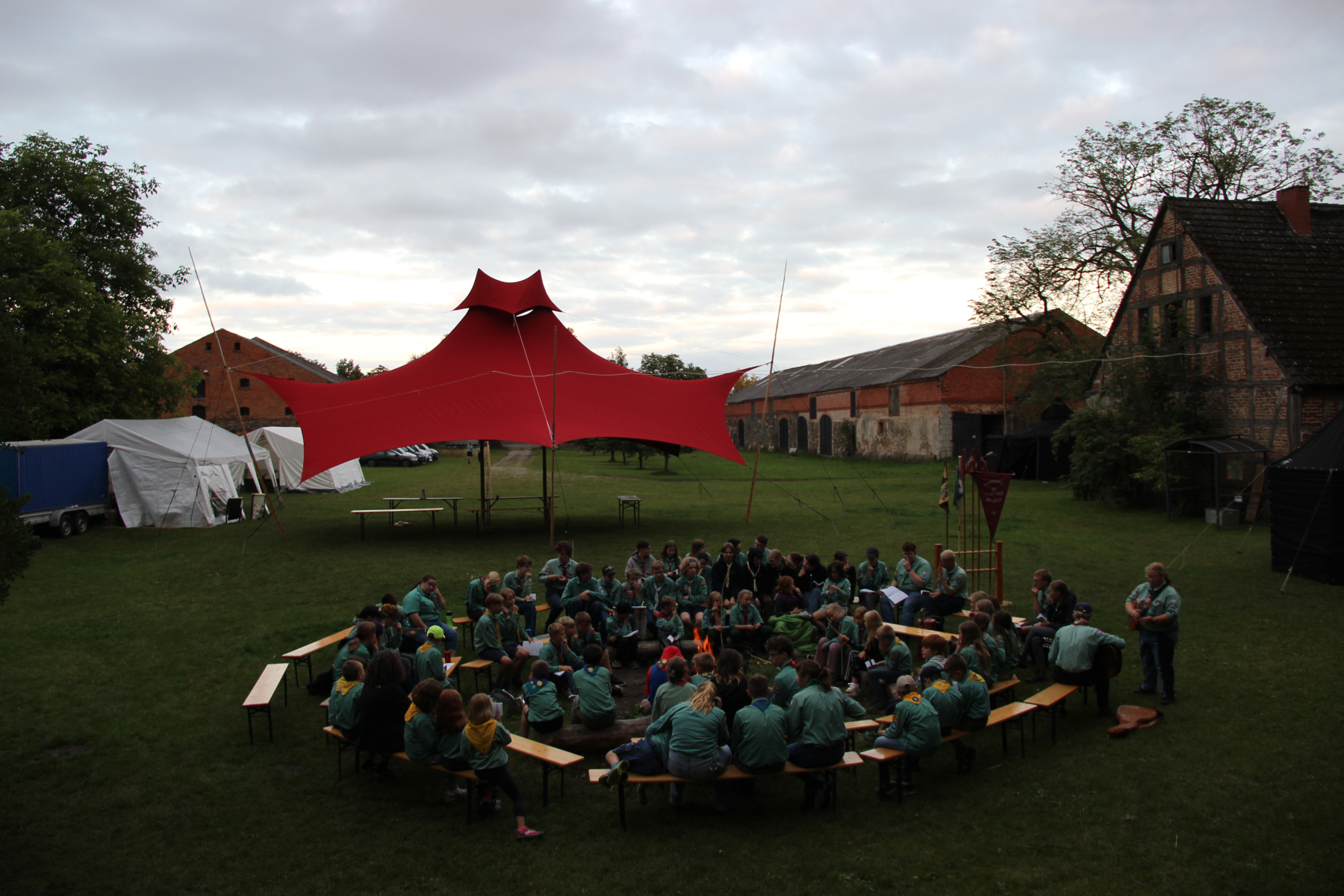 Nach dem Einzug hieß es dann: das Gutsgelände erkunden. 🏕️ Am Abend gab es die erste Themeneinheit und natürlich Singen am Lagerfeuer, bevor es in die erste Nacht ging. 🔥
